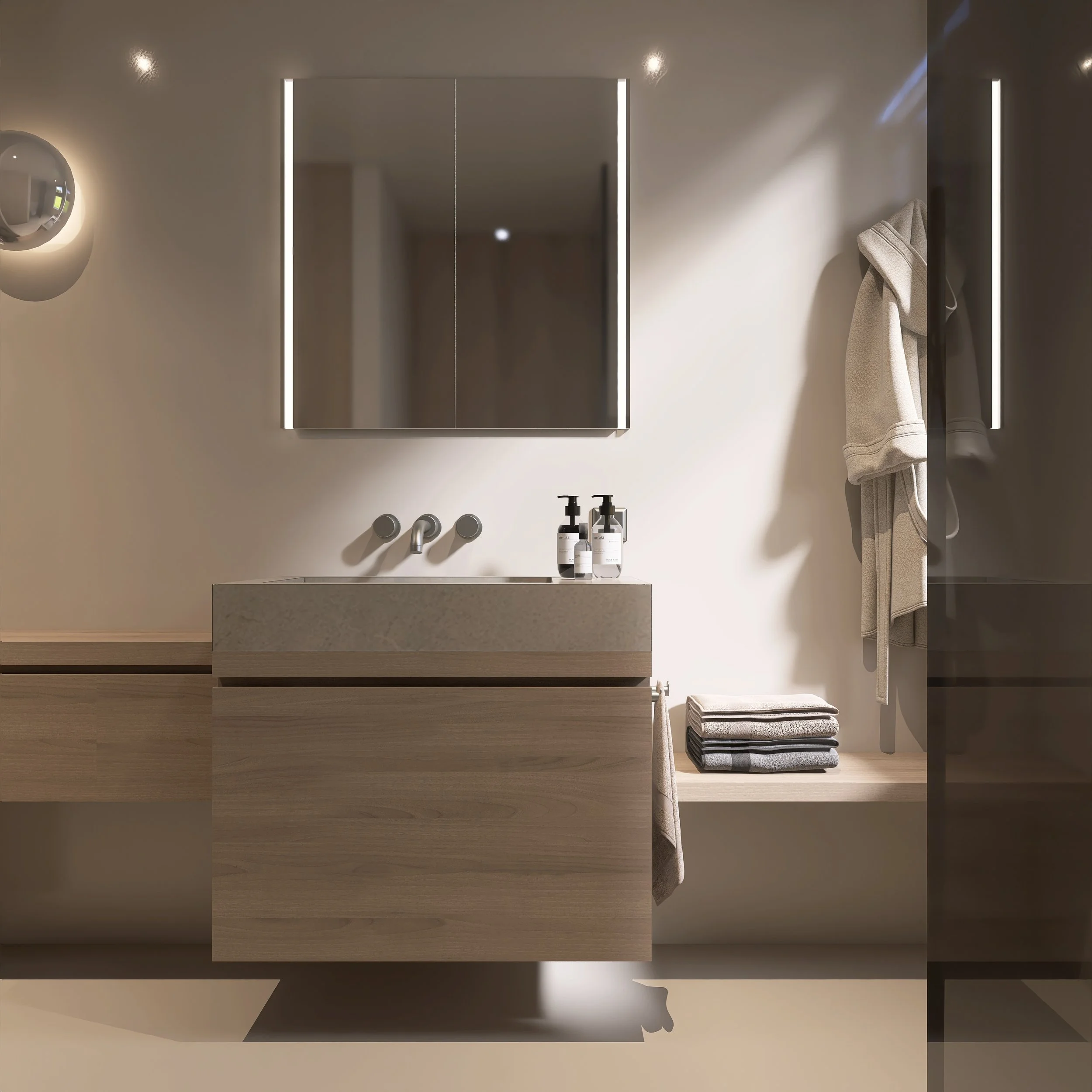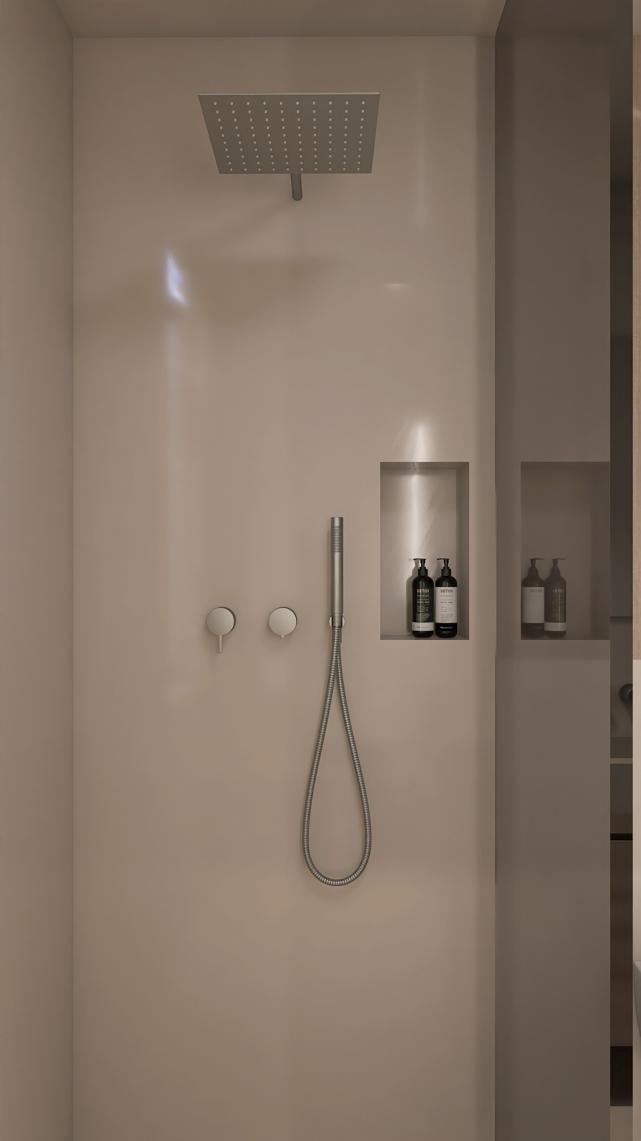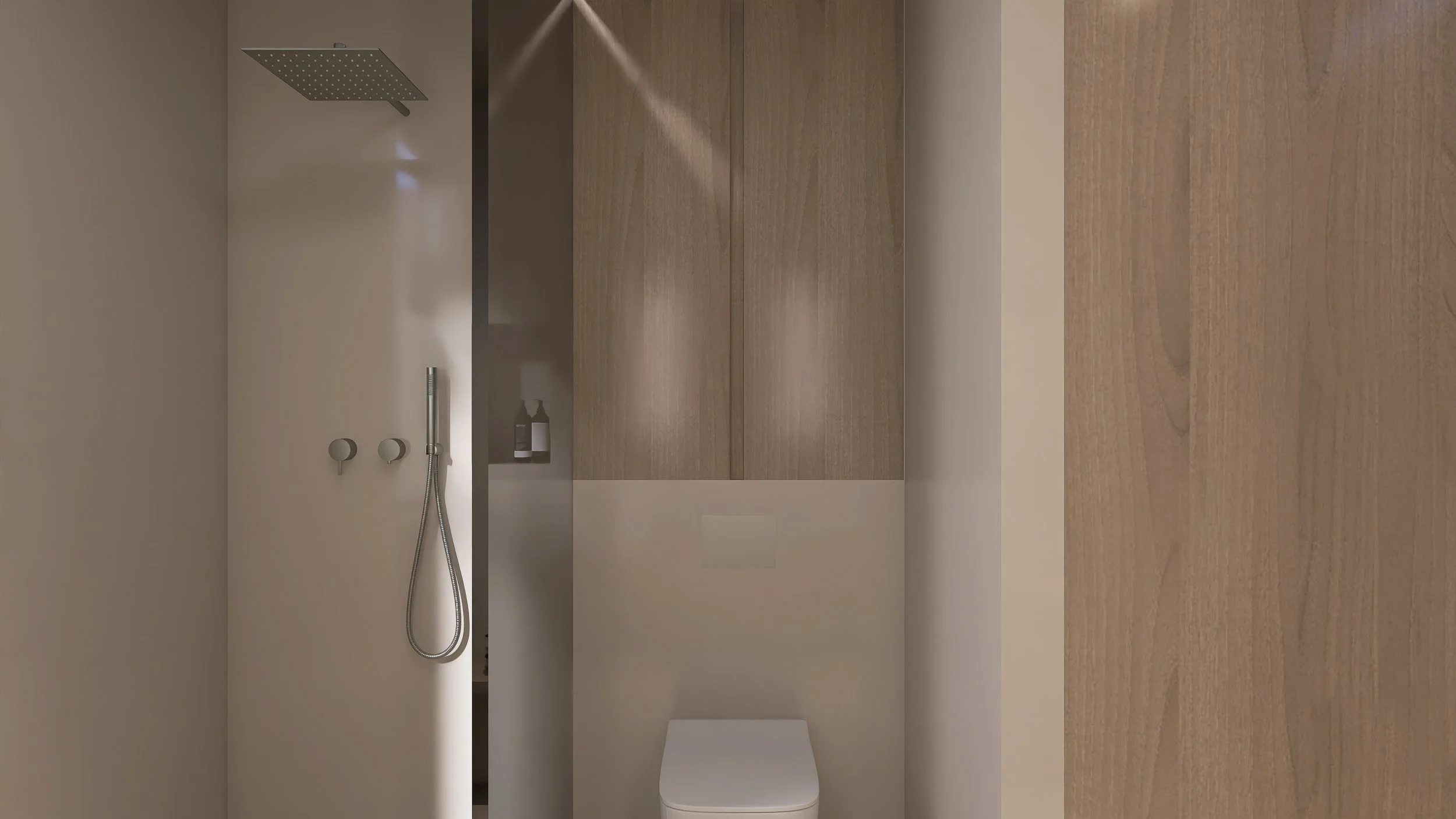 Ein fugenloser Boden, warme Nussbaumtöne und klare Linien bilden den Rahmen für dieses Bad – reduziert im Ausdruck, durchdacht im Detail. Waschmaschine und Trockner verschwinden dezent hinter maßgefertigten Fronten. Eine eingelassene Nische über dem WC und ein bündig integrierter Spiegelschrank schaffen zusätzlichen Stauraum, ohne den Raum zu überladen. - Ein Bad, das aufgeräumt wirkt – und dabei nichts vermissen lässt.